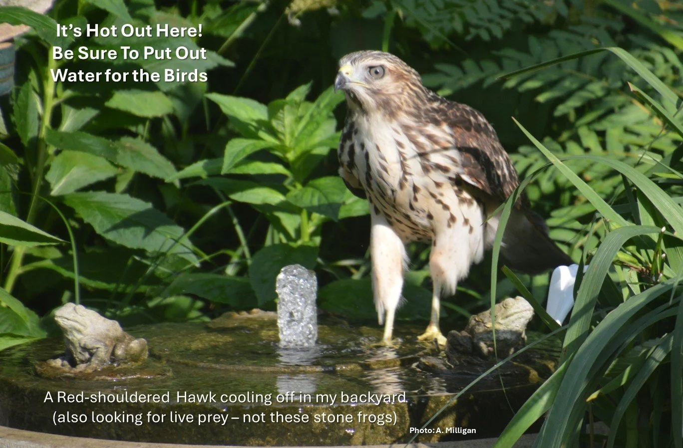 Stay cool Stewards and don’t forget to help wildlife stay cool – add a water source to your yard to help them survive the heat. This immature, Red-shouldered hawk (note it’s yellow irises) made its presence known with its loud calls well before I saw it cooling off in my fountain. It’s primarily a forest dweller but can be found where houses have forested areas that make for good hunting grounds. Unlike the Appalachian Azure butterfly, these raptors, like most, are generalists and feed on many types of prey including amphibians, reptiles, birds, and small mammals like voles and squirrels. As you’d expect, it will be well-fed if it stays in my yard.