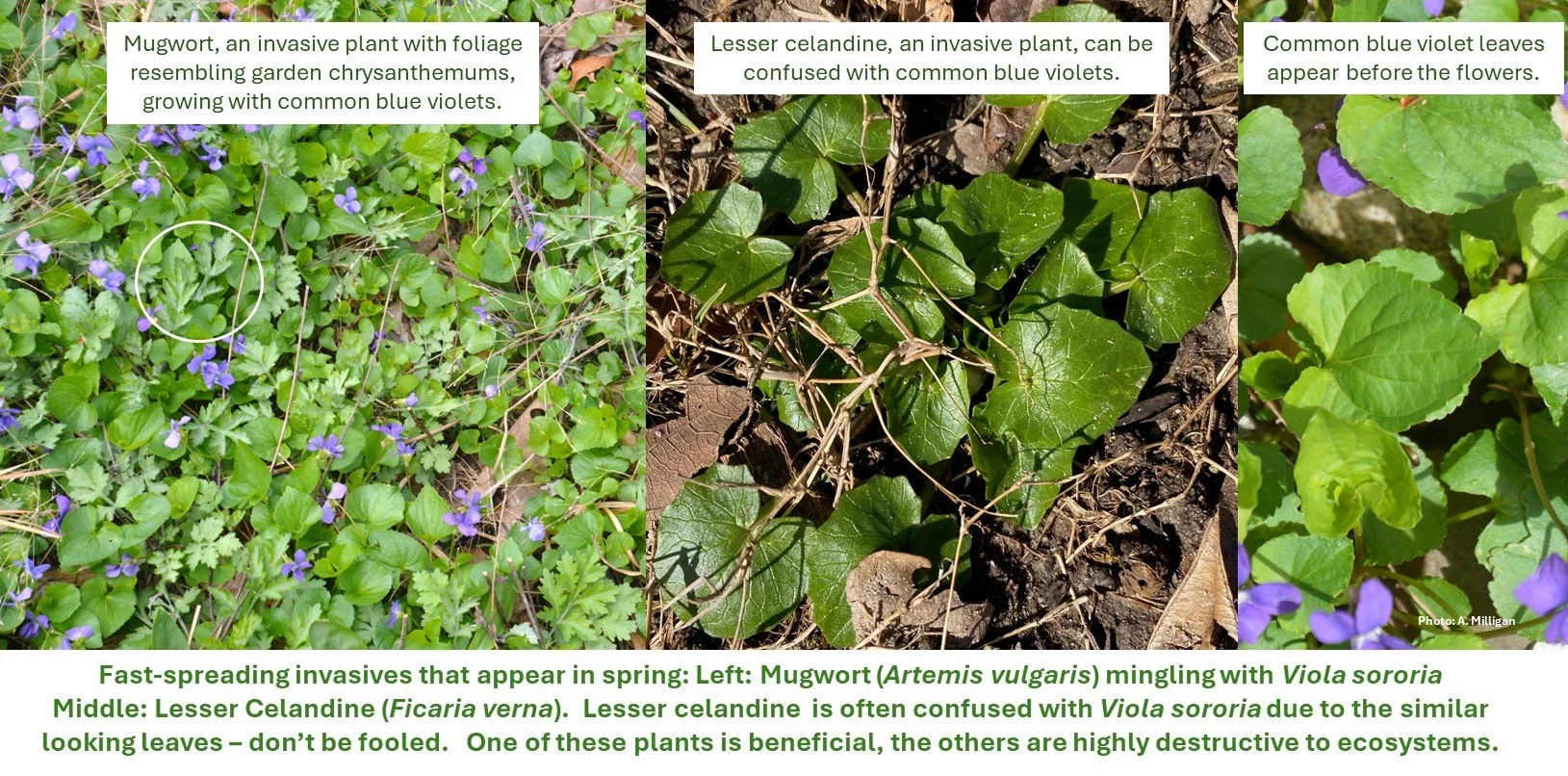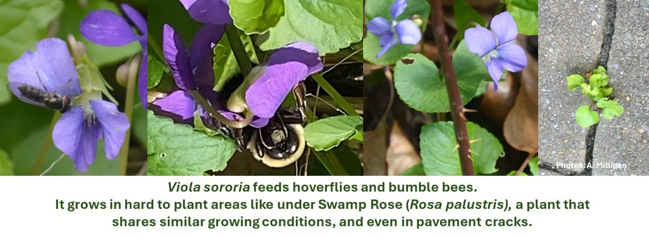 In spring, as I begin to see the true invasive plants that are trying to take hold in my yard and elsewhere, I welcome Viola sororia. Plants like mugwort (Artemisia vulgaris) and lesser celandine (Ficaria verna) are true bullies, harmful plants that will suppress native ephemerals; the latter has leaves that can be confused with Viola sororia. Understanding the colonizing nature of common blue violets and the many benefits it provides to the environment, makes me appreciate it more and even employ its assertive behavior as a deterrent against some of these truly invasive plants. Confronting invasives in a garden is not an easy matter – Viola sororia is one plant that can help, and it looks beautiful doing it.