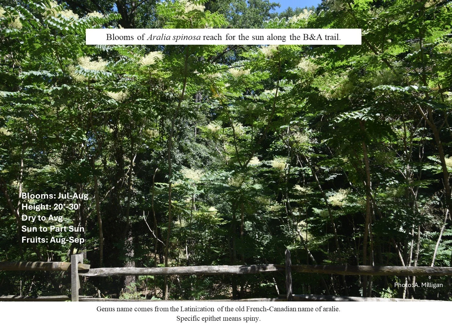 Anyone visiting one of the many trails in Maryland’s deciduous forests in late summer and early fall, is certain to see a remarkable plant lighting up the woodland with its massive plumes of flowers – the highly thorny and very tall shrub, Aralia spinosa, commonly known as the Devil’s Walking Stick. Its blooms can be enjoyed from a distance; they appear as clusters of floating clouds and yet, upon closer inspection, they are inflorescence of 5-petaled creamy white flowers, teeming with pollinators, a wondrous sight to behold.