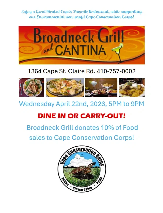 When you have dinner between 5 PM and 9 PM on April 22nd at the Broadneck Grill in Cape St Claire, the restaurant will donate 10% of the total food receipts from that evening to Cape Conservation Corps! Since 2016, they have contributed thousands of dollars to CCC. So, enjoy dinner (dine in or take out), and support CCC!
