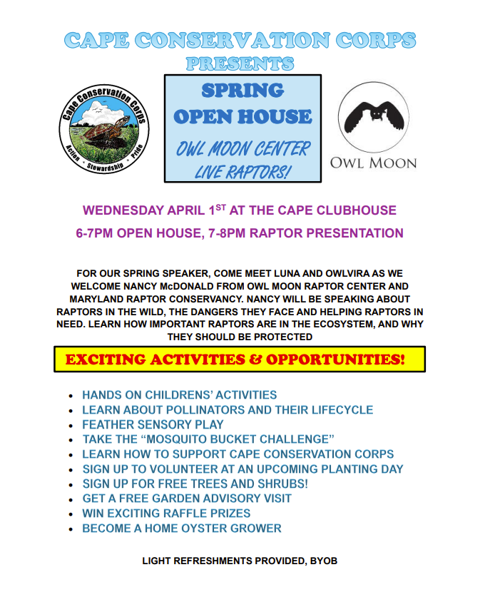 Mark your calendars! Please join the Cape Conservation Corps at the Cape Clubhouse on Wednesday, April 1, 2026 for CCC’s Spring Open House and biannual speaker event. It will be a fun and informative evening!