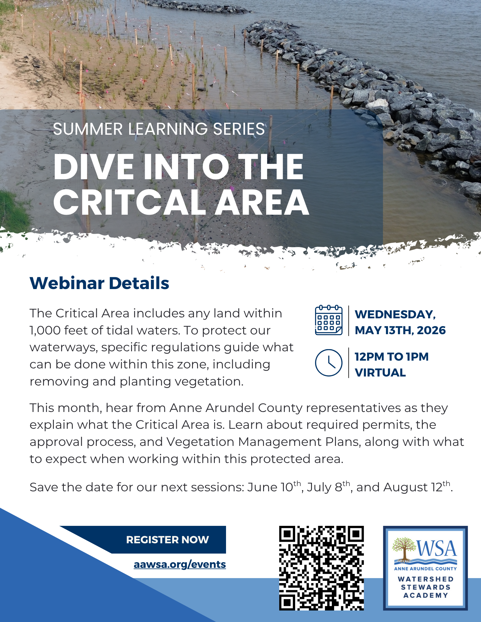 If you live, work, or spend time in the Critical Area, this virtual lunchtime webinar is for you! Hear from Anne Arundel County representatives as they explain what the Critical Area is and why it matters. You’ll learn about required permits, the approval process, and Vegetation Management Plans, as well as what to expect when working within this protected area.