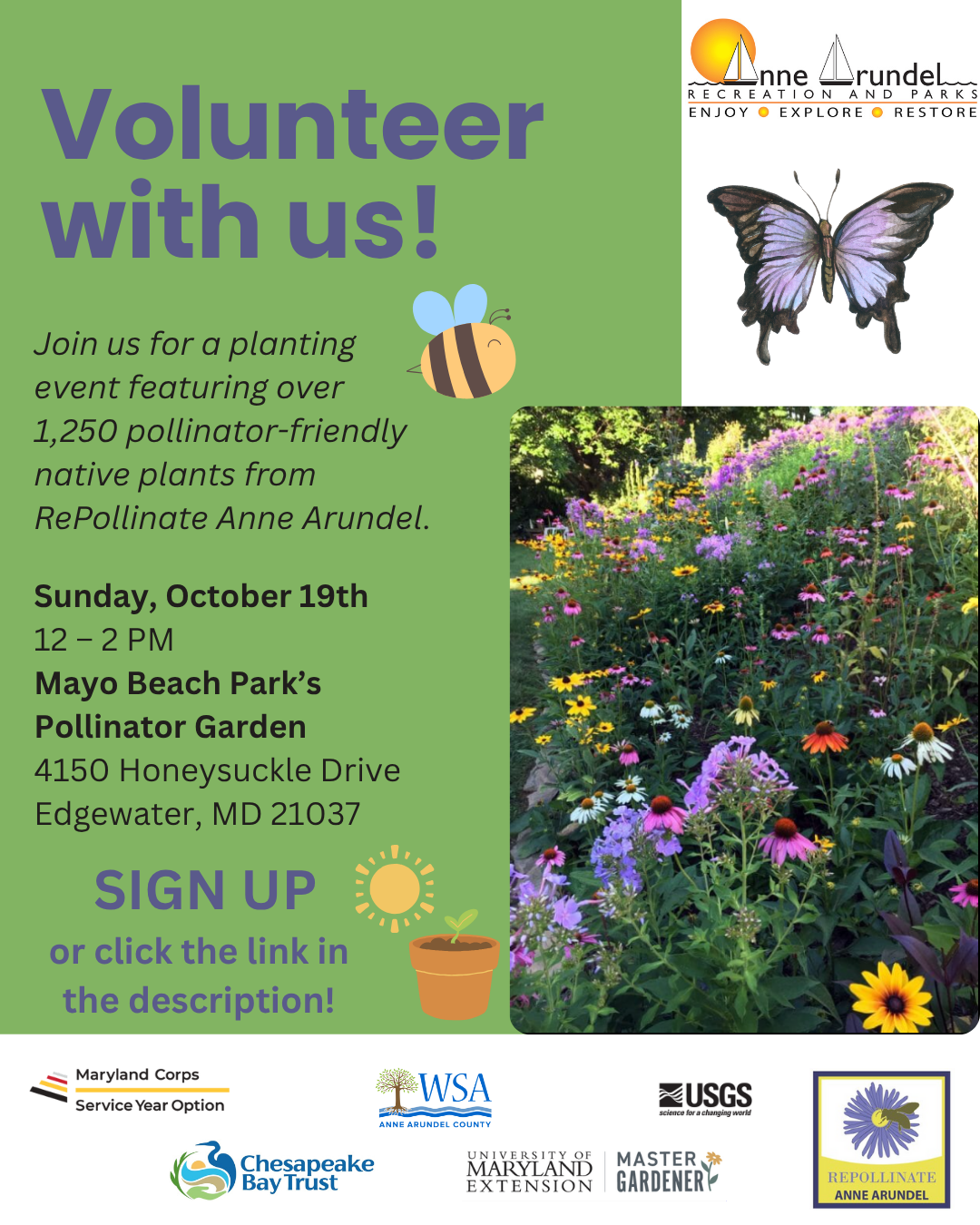 Join us for a planting event featuring over 1,250 pollinator-friendly native plants from RePollinate Anne Arundel! We will be holding the planting in Mayo Beach Park’s Pollinator Gardens. Gardening tools will be provided.