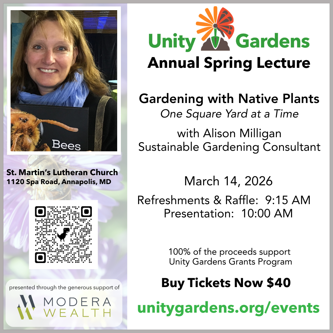 The Unity Gardens mission is to educate diverse Anne Arundel County communities to create and sustain ecological spaces that enhance life—one native garden at a time. Join us in our quest to build a healthier Chesapeake Bay region with the power of native plants: Sponsorship opportunities and ticket sales are now open for Unity Gardens’ 2026 Annual Spring lecture! This year's event will feature Alison Milligan, a sustainable gardening expert with deep ties to and knowledge of Anne Arundel County.